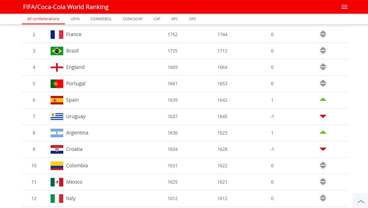 In vergelijking met de vorige ranking die begin april verscheen zijn er immers geen interlands meer gespeeld. 2003-2018 ZOS Lda. La Clasificación mundial de la FIFA oficialmente Clasificación mundial FIFACoca-Cola conocido como Ranking FIFA.